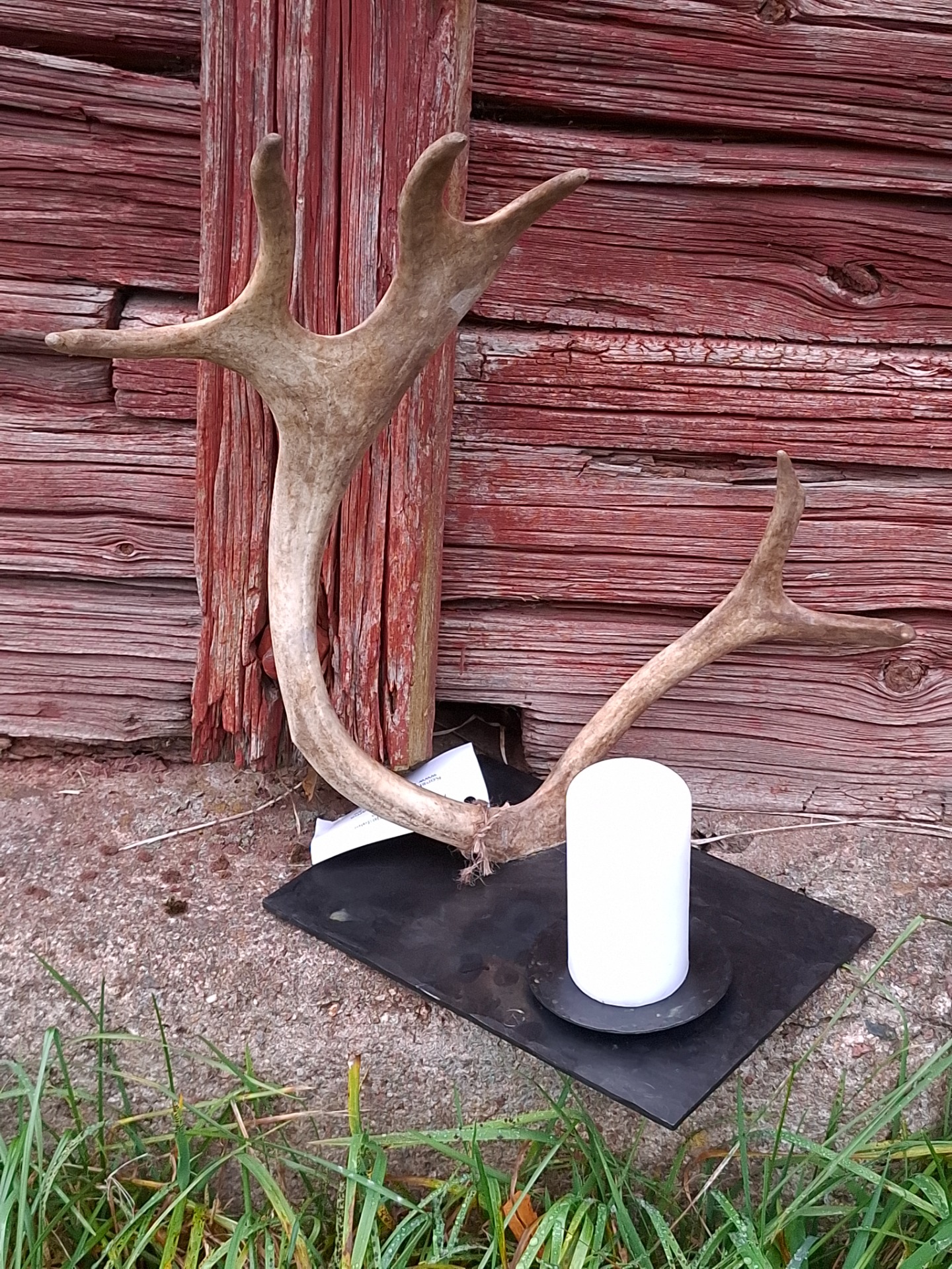 Renhornsljusstake för klotljus (ljushållare med fat och en "pigg") ca 40 cm hög och bred. Tänk på att det är olika horn så alla ljusstakar är olika.