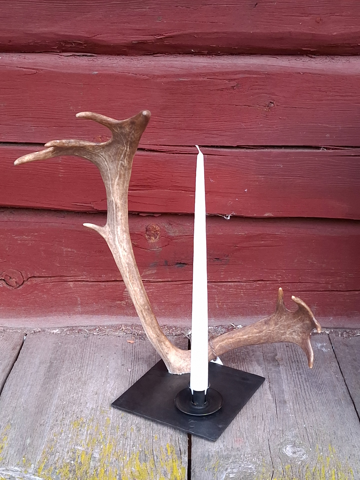 Renhornsljusstake för ett ljus, ca 40 cm hög och 40 cm bred, tänk på att hornen varierar så det kanske inte finns just denna ljusstake utan likvärdig.